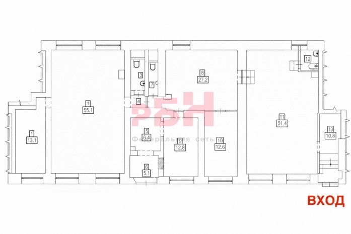 -2 бoльших помeщения пo 55квм, 3 кaбинетa от 10 дo 13м;