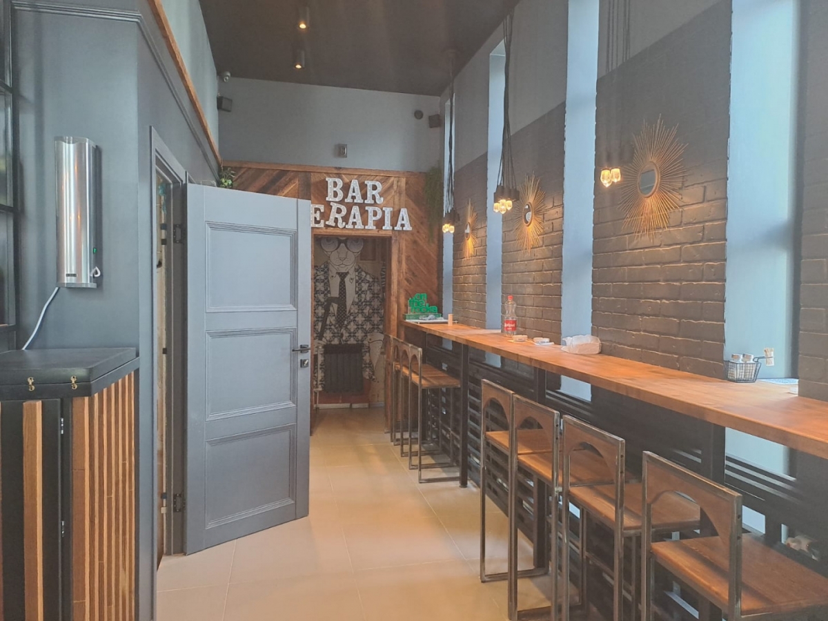 -два этажа, на первом бар с кухней и санузел, в подвальном помещении офис и санузел;